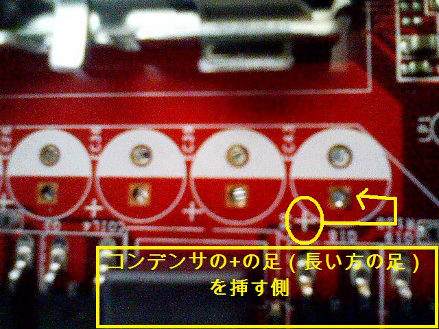 コンデンサの+と-を間違わないように確認してマザーボードにコンデンサを挿します。