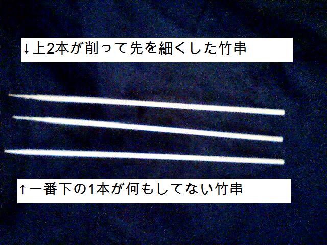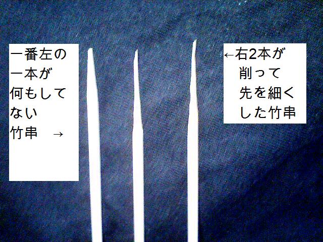 ここで工夫したのが、竹串の先をカッターで鉛筆を削る要領で先の部分を1cm細くしたことです。