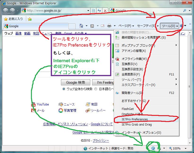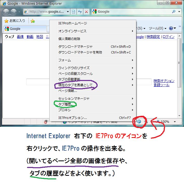 もしくは、Internet Explorer右下のIE7Proのアイコンをクリック