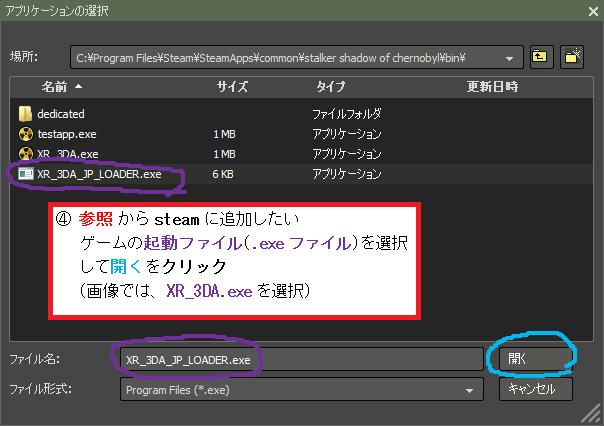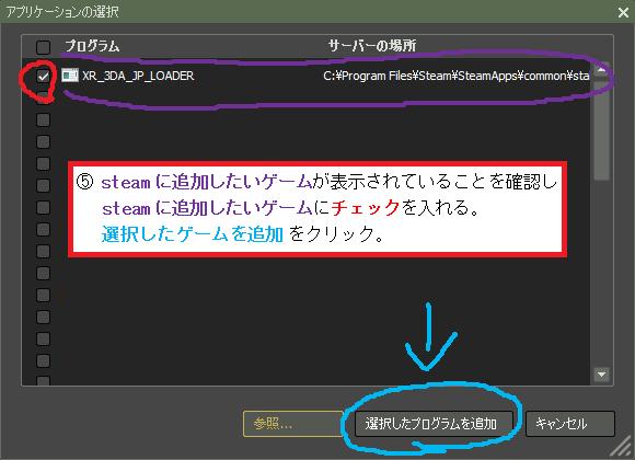 (画像では、XR_3DA.exeを選択) - アプリケーションの選択に、追加したいゲームが表示されてることを確認し、