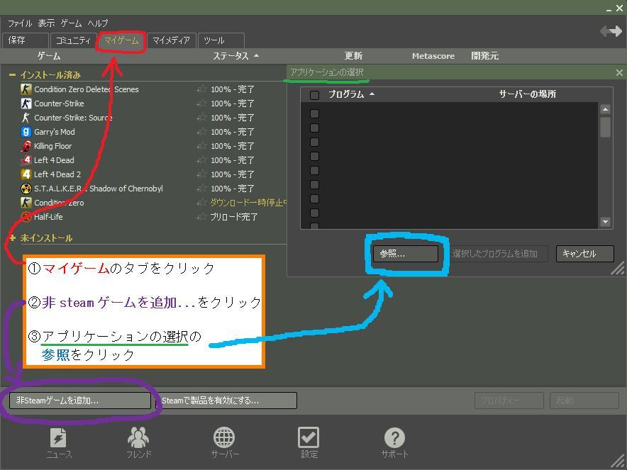 選択したプログラムを追加をクリック - steamのマイゲームのタブに追加したゲームを、